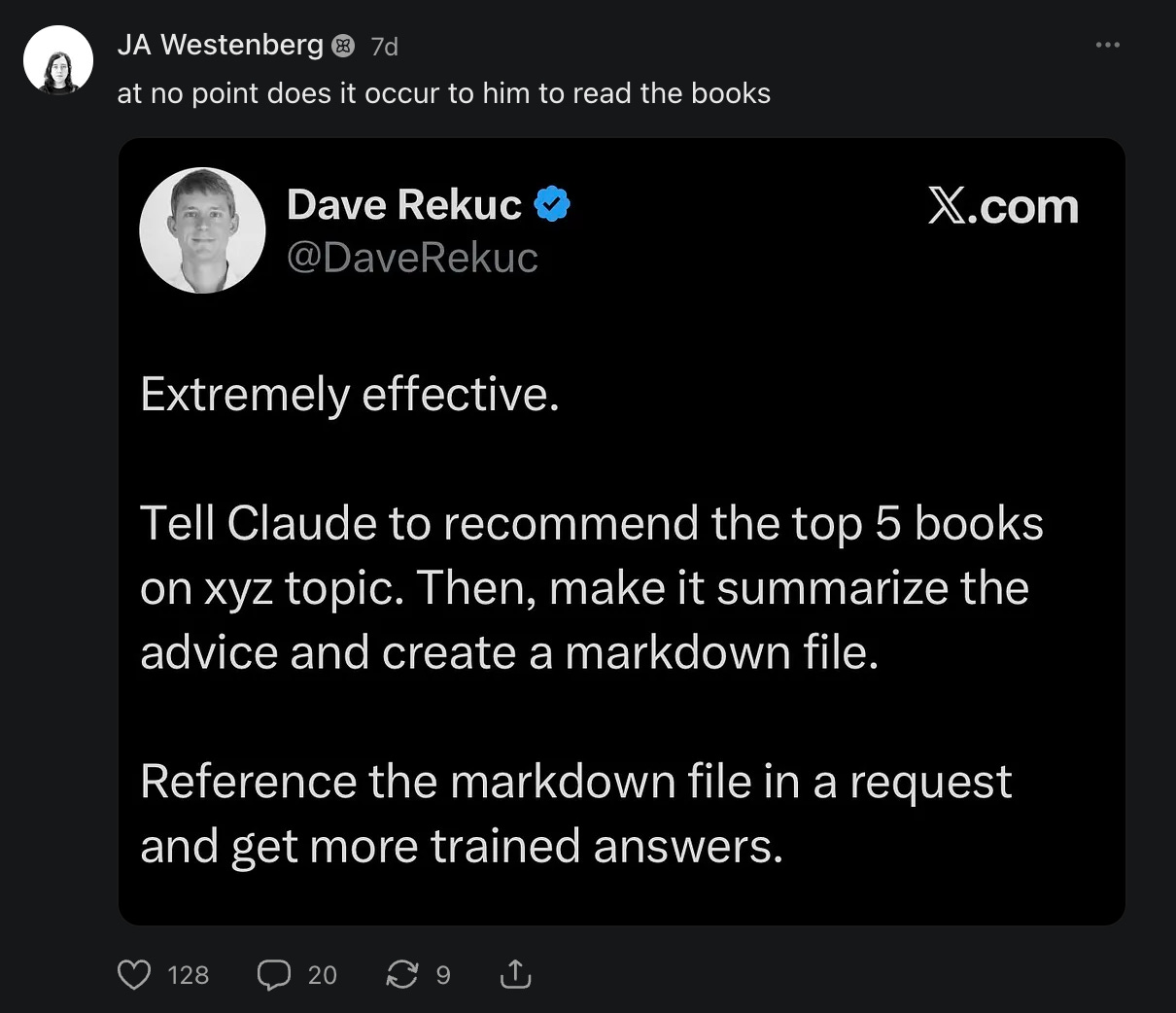 Is “You are what you eat” now “you are how you think”? In pursuit of some goal, like getting the information required to do a job, it makes sense to go for efficiency. But I’ve noticed that in any other case, whether it’s my own or someone else’s original thinking - through books, essays, and art - I cringe away at the extracts (I’m looking at you, LinkedIn and Twitter threads). They feel food-like, like an intellectual equivalent of Soylent or Huel: fast, useful, tasteless and dead. And you feel that deadness, the gap where the connective tissue should be to something human.